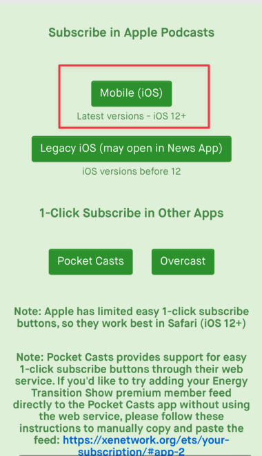 Here's how the one-click subscribe button from our subscription wizard (https://energytransitionshow.com/subscribe) can look on an iOS device . Use this if you're running into issues with copy and paste: